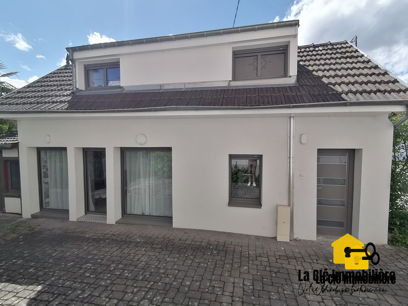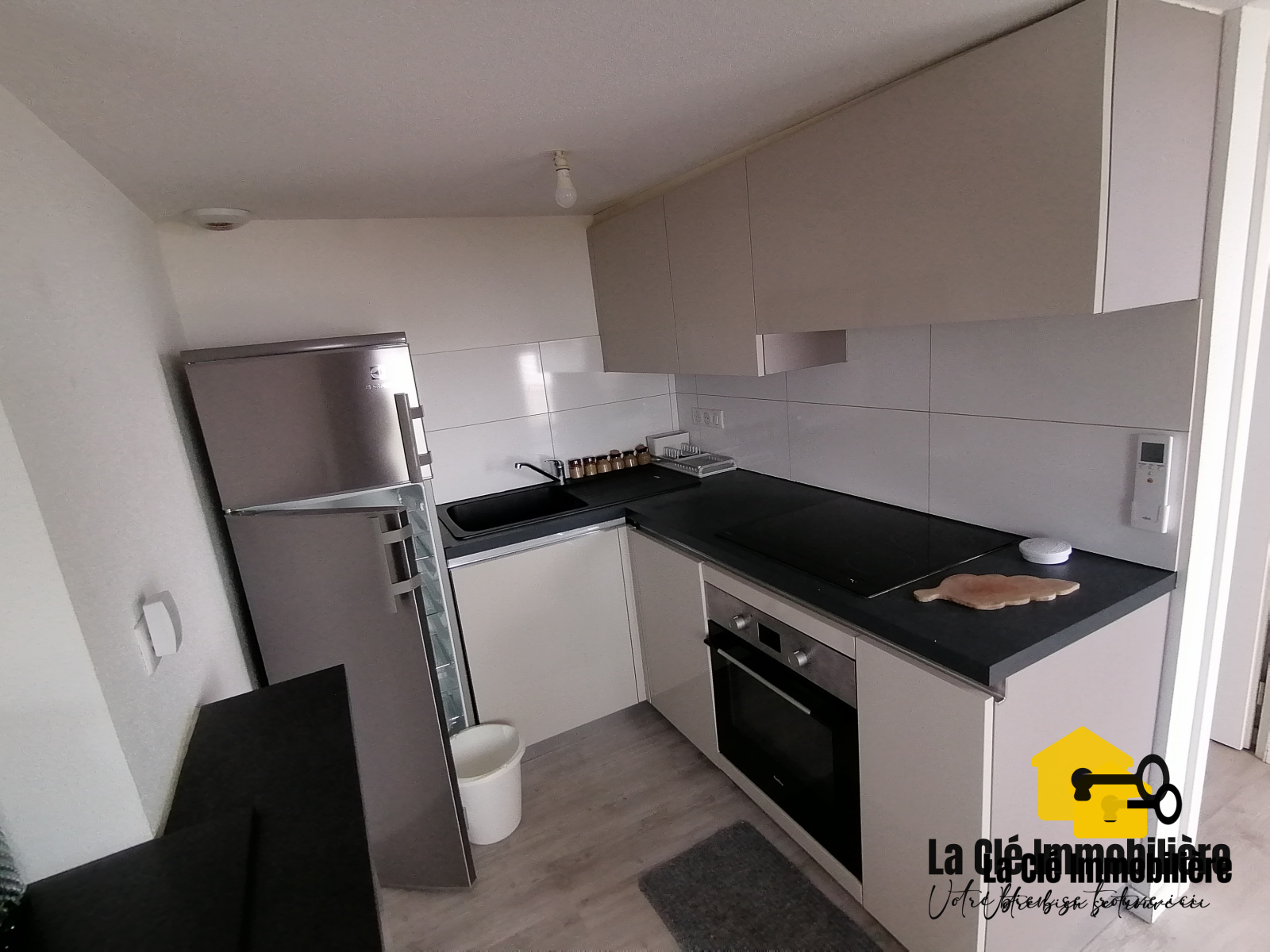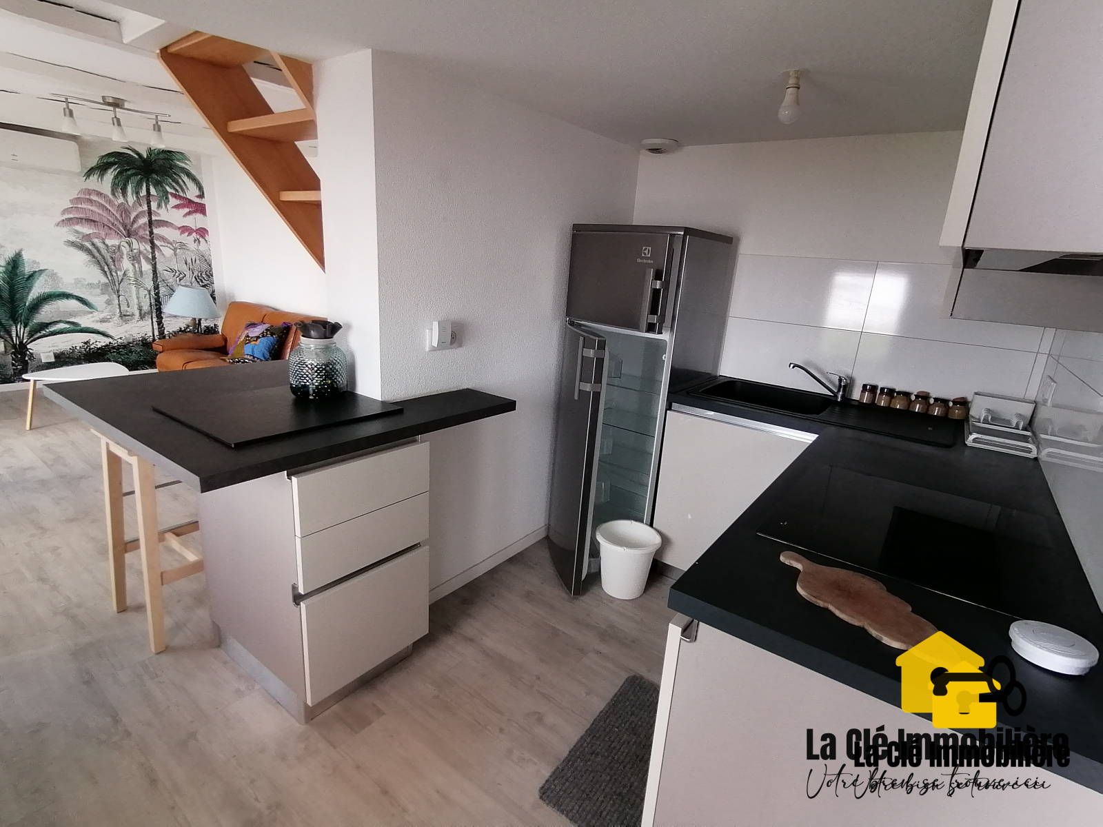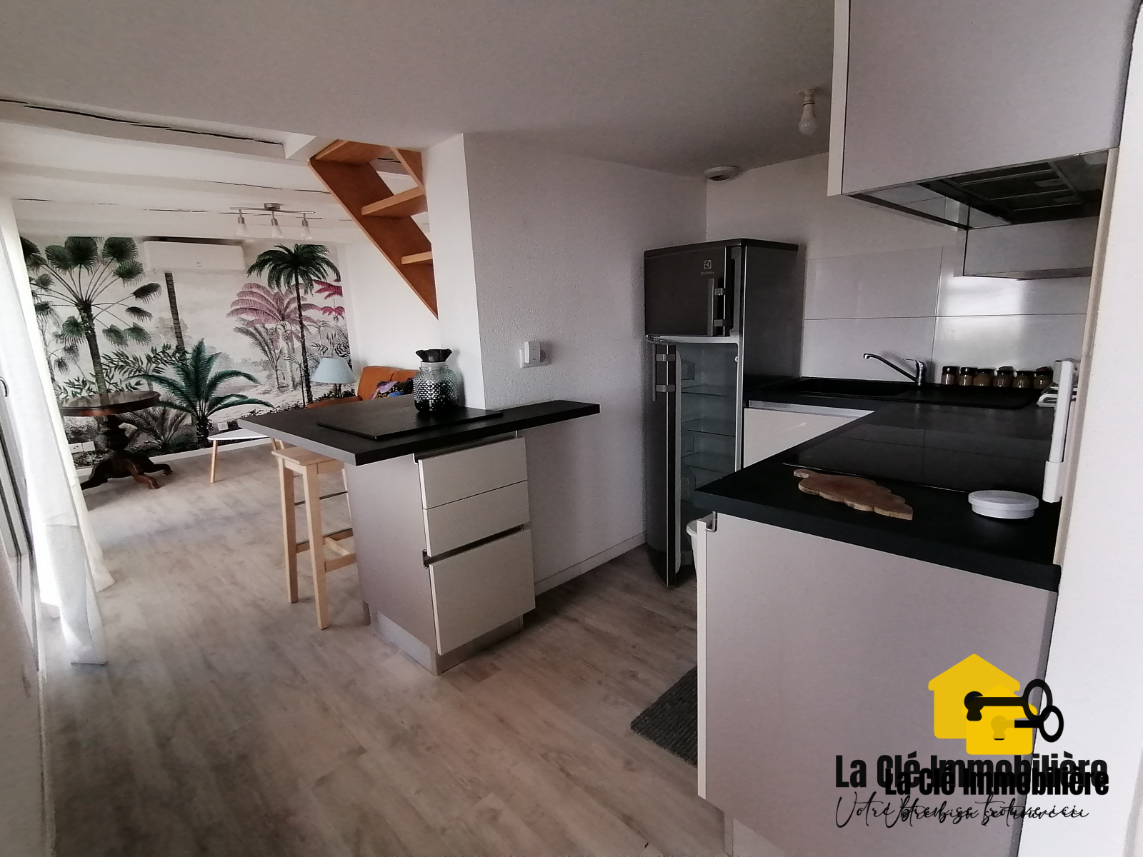 L'habitation, spacieuse et lumineuse, est composée d'une cuisine ouverte sur un salon/séjour toute équipée comprenant un réfrigérateur/congélateur ELECTROLUX, un évier simple vasque, une plaque de cuisson vitrocéramique AMICA, un four traditionnel AMICA, un îlot central avec des éléments de rangement ainsi que du mobilier de cuisine pour le rangement. Un WC suspendu avec lave-mains complète le rez-de-chaussée.