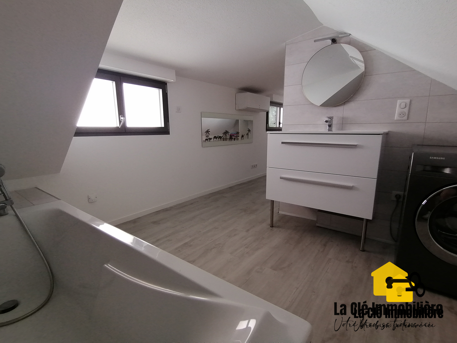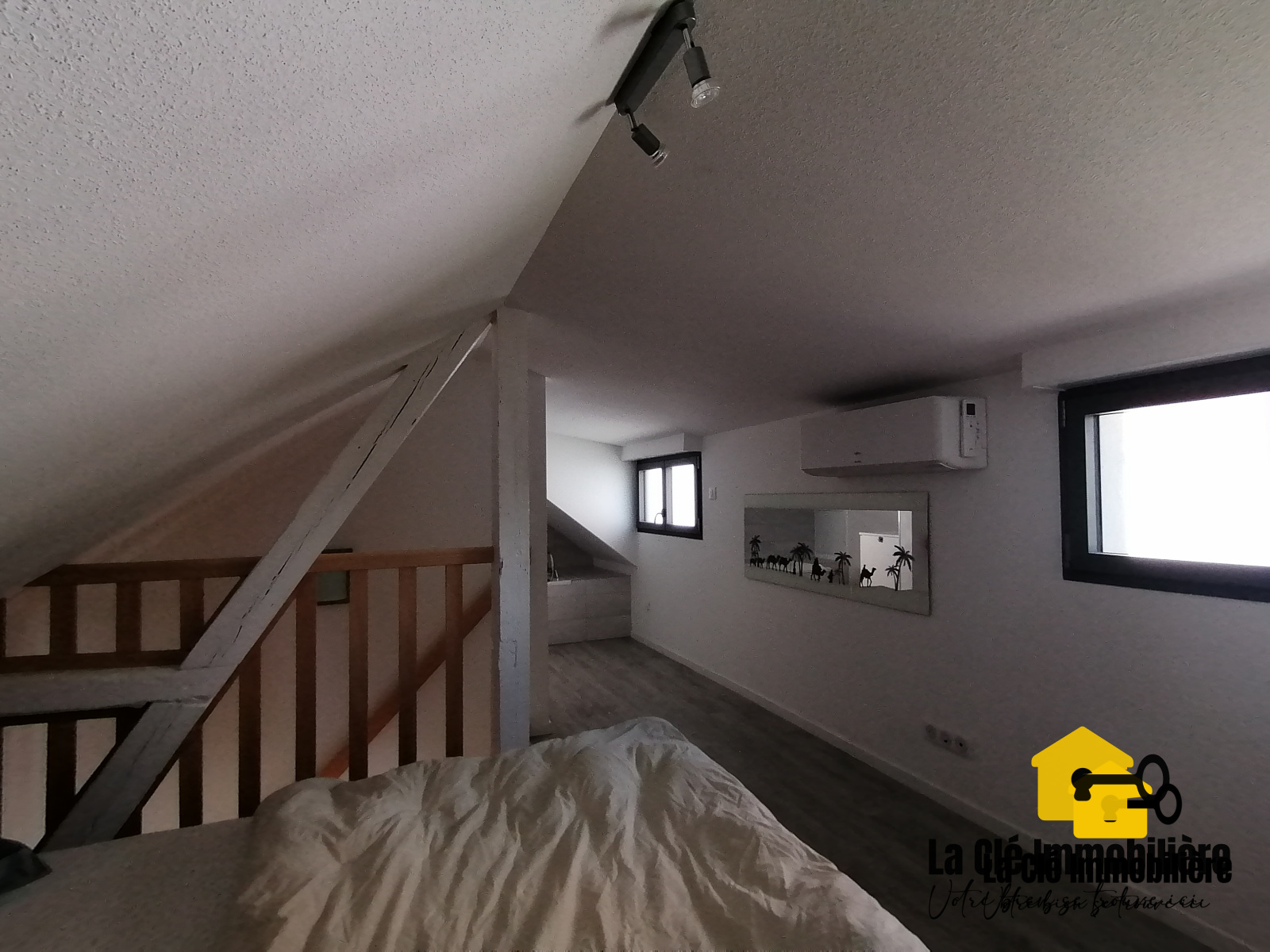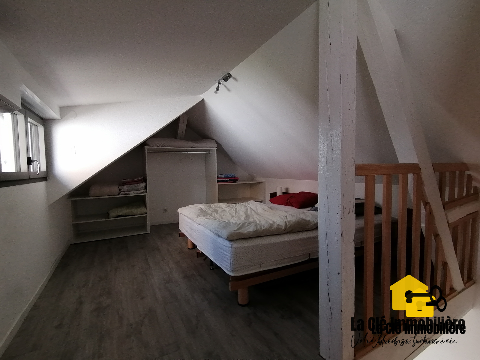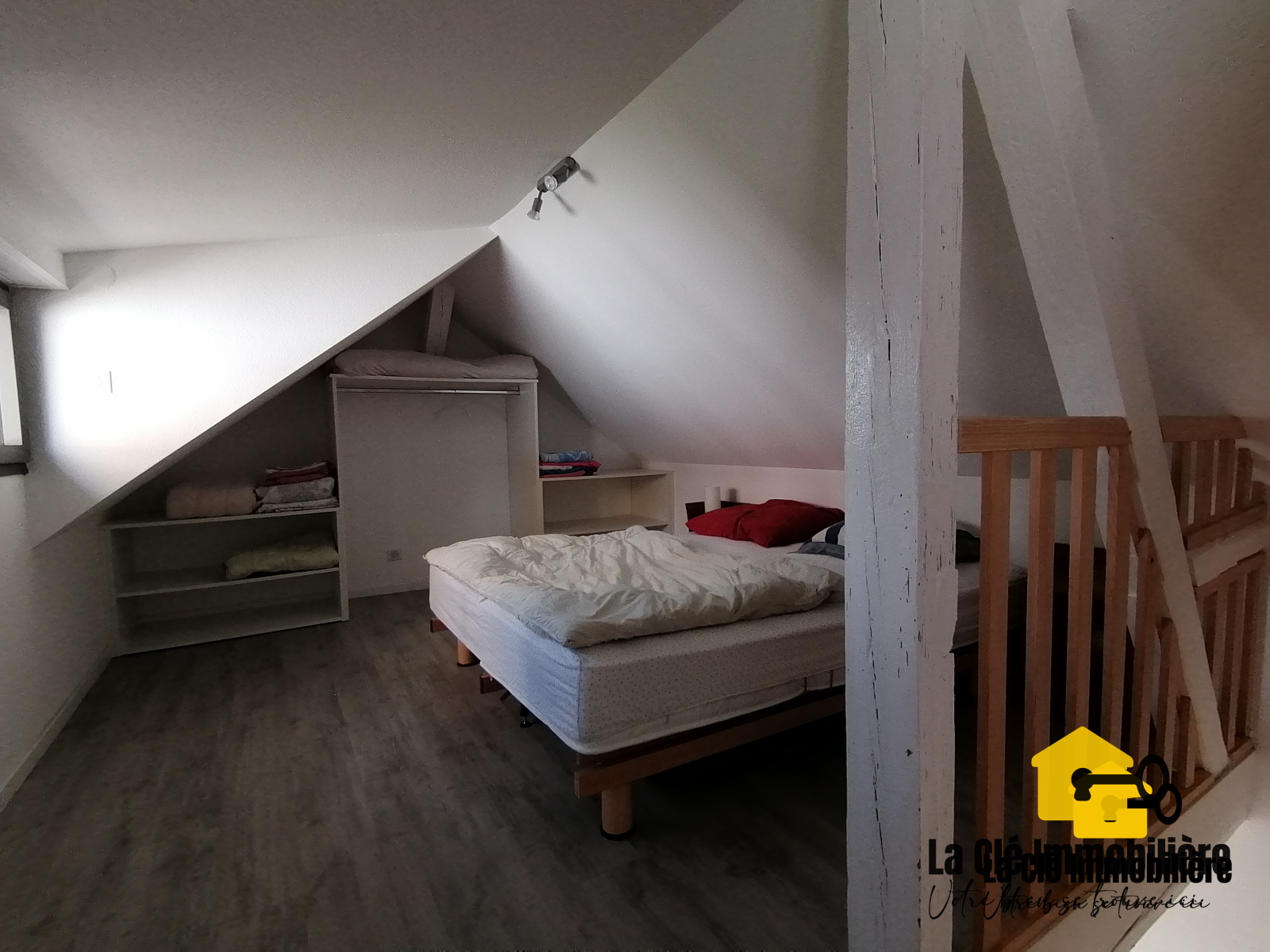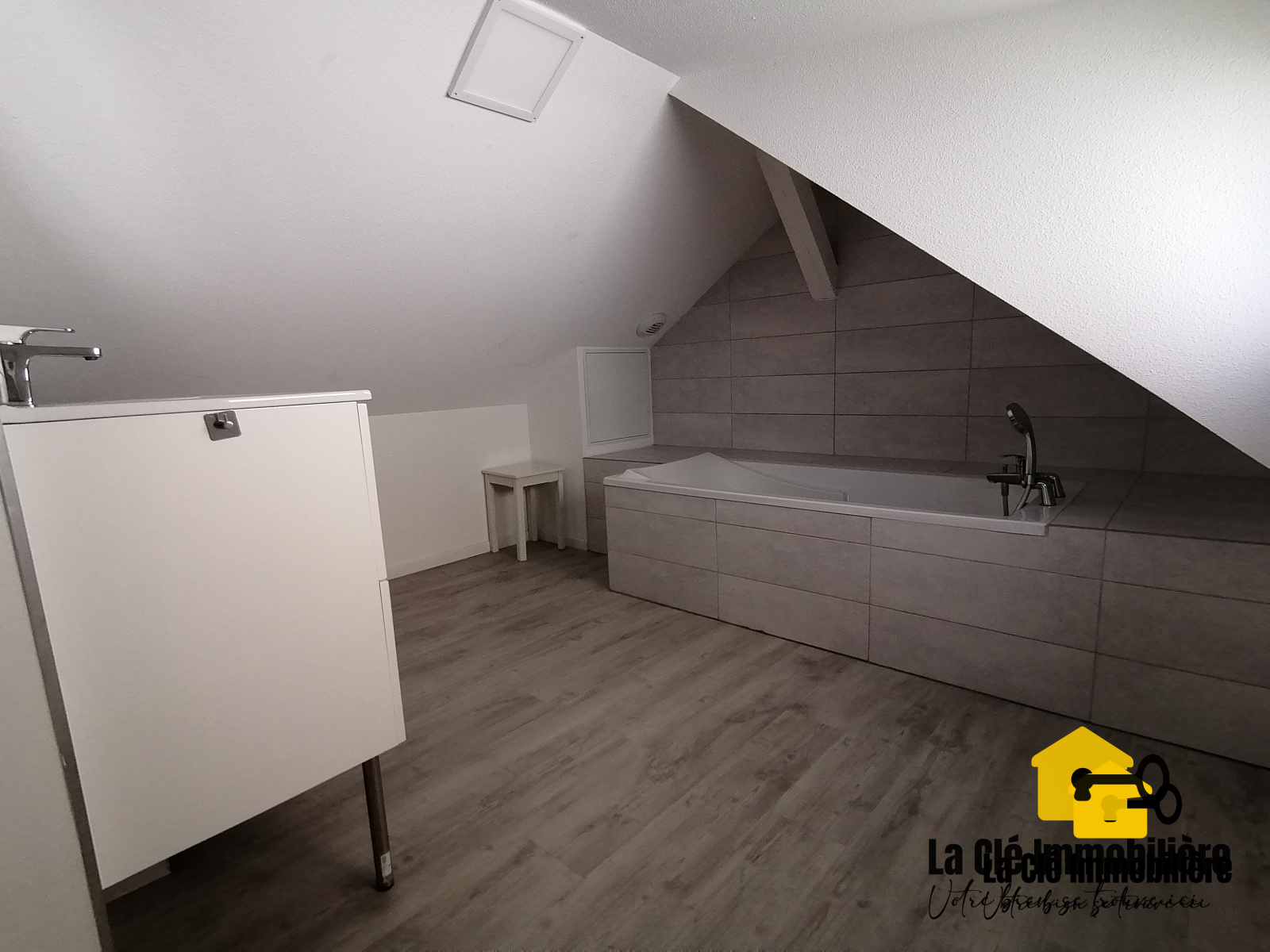 La salle de bains située à l'étage comprend, quant à elle, un lavabo avec son sous-meuble de rangement à tiroir, un miroir et une baignoire. Une chambre avec lit double et armoire compléte cet étage.