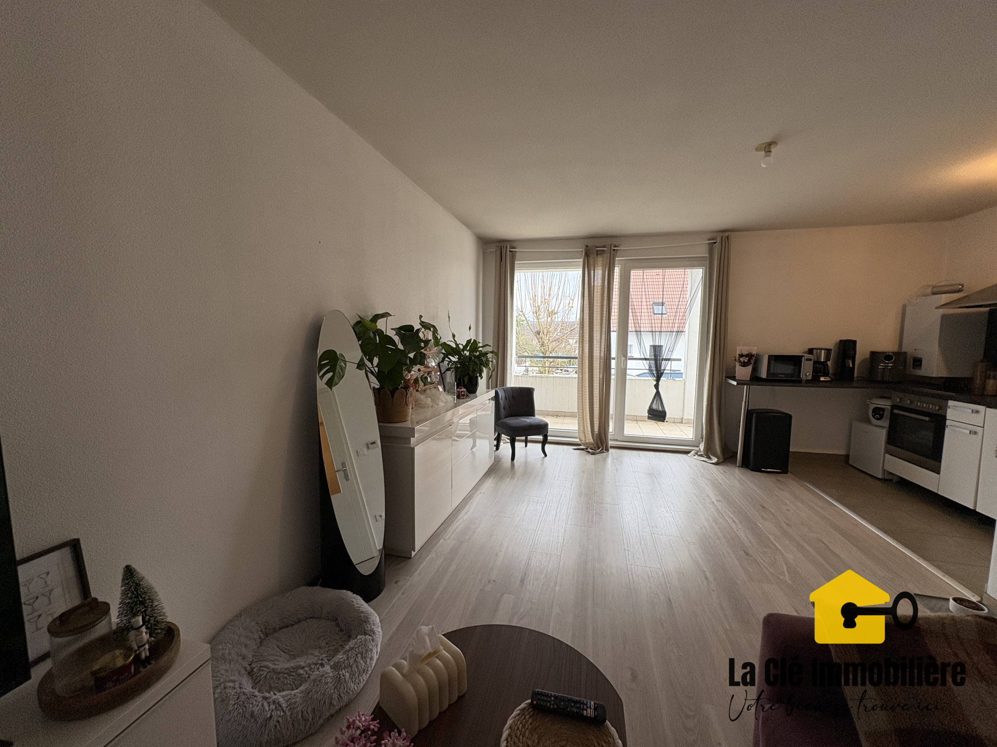 Kembs (68680)Dans la charmante commune de KEMBS, à proximité du canal de Huningue et du port de plaisance, se trouve ce très bel appartement au sein d'une petite copropriété au cœur d'un quartier résidentiel. Situé au premier étage, ce spacieux et lumineux F2 d’une superficie totale de 45,11m2 est composé d'une cuisine équipée ouverte sur salon/séjour donnant accès à un balcon en L de 20,15m2 environ, d'une chambre ayant une superficie de 11,85m2, d'une salle de bains carrelée et équipée comprenant une baignoire, une simple vasque avec son sous - meuble de rangement, un porte / sèche serviette et un WC .