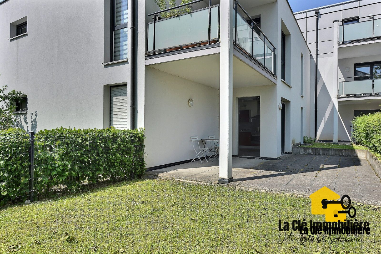 En extérieur, nous avons une grande terrasse de 27m2 et un jardin privatif de 64m2